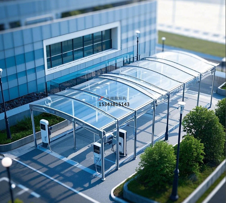 ??????? 膜結(jié)構(gòu)罩棚在采光與通風(fēng)方面優(yōu)勢(shì)顯著。許多膜材具有一定透光性,能讓天然光線柔和地灑入充電區(qū)域,既節(jié)省電力照明本錢(qián),又為車(chē)主營(yíng)造出明亮、舒適的充電環(huán)境。而且,膜結(jié)構(gòu)的開(kāi)放性與合理的空間布局,利于空氣天然流通,有用驅(qū)散充電進(jìn)程中或許產(chǎn)生的熱量與異味,保持空氣新鮮,下降安全隱患。在一些悶熱的夏天,杰出的通風(fēng)可防止因溫度過(guò)高導(dǎo)致的充電設(shè)備毛病,保證充電站正常運(yùn)營(yíng)。