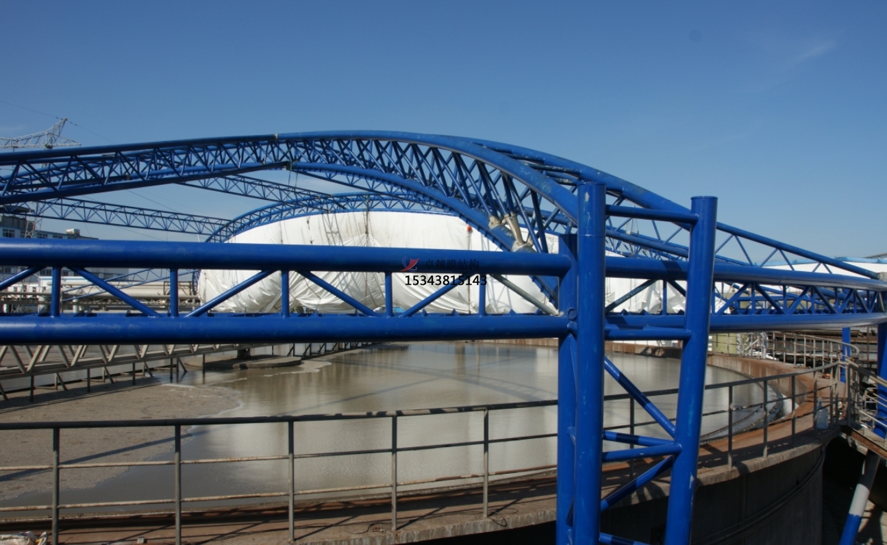 污水池反吊膜,顧名思義,是一種將薄膜材料以反吊的方式覆蓋在污水池上方的結(jié)構(gòu)。這種結(jié)構(gòu)通過鋼架或索網(wǎng)等支撐體系,將膜材料緊繃并固定于污水池上方,形成一個(gè)密閉或半密閉的空間,有效隔絕污水池內(nèi)的惡臭氣體和有害物質(zhì),防止其對(duì)外擴(kuò)散,同時(shí)保護(hù)膜材料免受污水池內(nèi)腐蝕性氣體的侵蝕。
